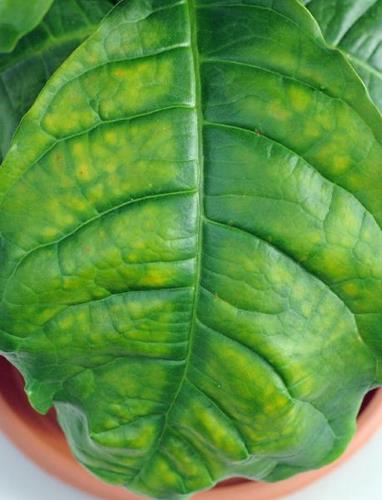 Clorosis de color amarillo-verde a naranja o bronce que empieza cerca de la vena central y va aumentando entre las venas. Una zona estrecha a cada lado de las venas central y laterales se mantiene verde, dando un aspecto moteado a la hoja. Dentro del tejido clorótico, se pueden desarrollar manchas irregulares y necróticas, con una delimitación marcada. Con frecuencia, en los márgenes de las hojas o en las nervaduras pueden aparecer pequeños puntos hundidos y anaranjados.
