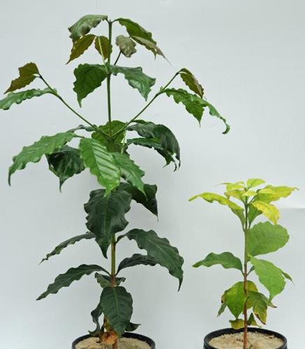 Hojas jovenes muestran una clorosis amarillo-verdoso entre las venas, luego uniforme. Con deficiencia avanzada se desarrollan puntos anaranjados y necróticos en el área marginal e intervenal. El crecimiento se reduce considerablemente.