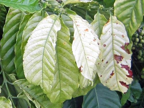 Hojas jovenes muestran clorosis amarillo-verdoso intervenal, posteriormente uniforme. Con deficiencia más avanzada, un toque de color anaranjado y puntos necróticos marrones se ven en el area marginal e intervenal de la hoja.