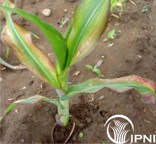 Los primeros síntomas consisten en clorosis internerval de las hojas más viejas. Conforme avanza la deficiencia las bandas amarillas muestran tonos rojizos y violáceos.