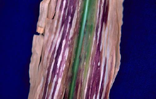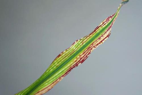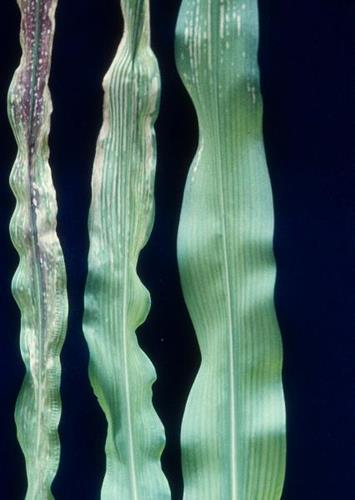 La hoja más afectada (izquierda) muestra tonos rojizos y violáceos con lesiones veteadas internervales. Mientras la hoja menos afectada (centro y derecha) muestra únicamente clorosis internerval y lesiones veteadas.