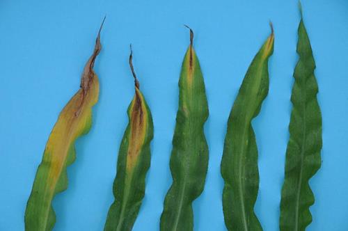 Las hojas se vuelven verde pálido-amarillentas empezando en la nervadura principal y continuando hacia la punta de la hoja (en forma de V). En caso de una deficiencia mayor, se desarrolla una necrosis desde la punta de la hoja.