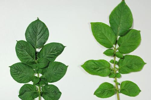 Las hojas son de color verde pálido (izquierda) con tamaño reducido y crecimiento detenido. Los síntomas se ven a menudo primero en las hojas más jóvenes.