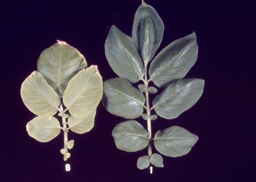 Las hojas son de color verde a amarillo pálido (izquierda) tienen un tamaño reducido y el crecimiento puede sufrir retrasos. Estos síntomas se ven a menudo primero en las hojas jóvenes.