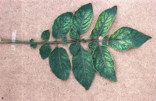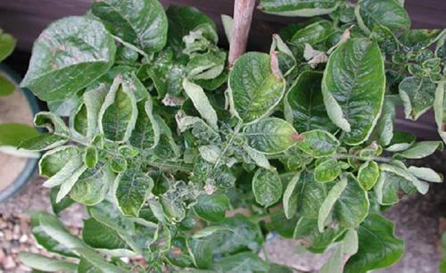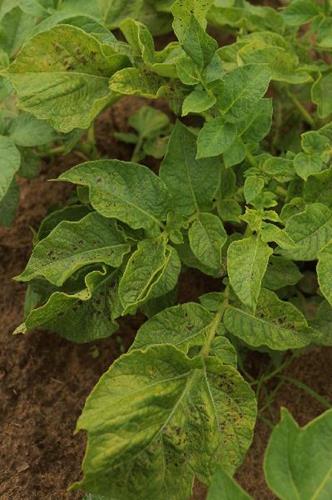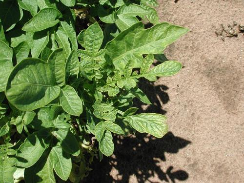 Con deficiencia de zinc, las hojas son más pequeñas y el crecimiento se reduce. Las hojas están deformes y se doblan hacia dentro ("hoja de helecho de la papa"). Aparecen primero parches de color marrón grisáceo o bronce en medio de las hojas y más tarde, en todo el follaje.
